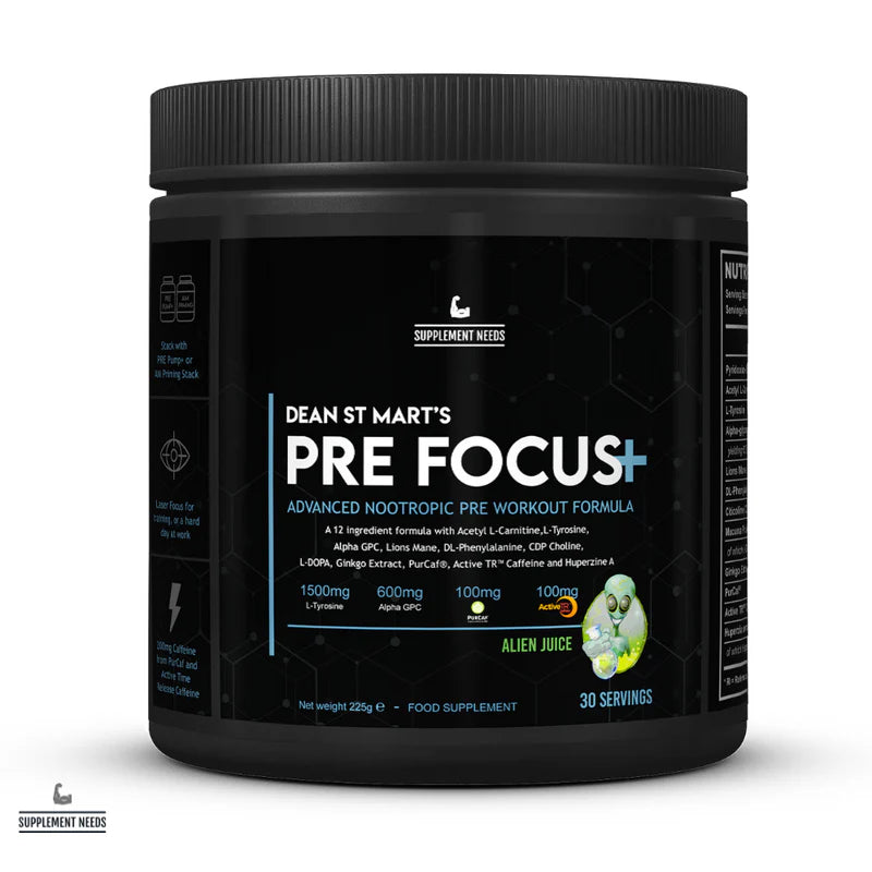 PRE Focus+ is a fully transparent, non-proprietary, stimulant nootropic pre workout product containing 12 ingredients at efficacious doses as part of the Supplement Needs Dean St Mart Performance range.