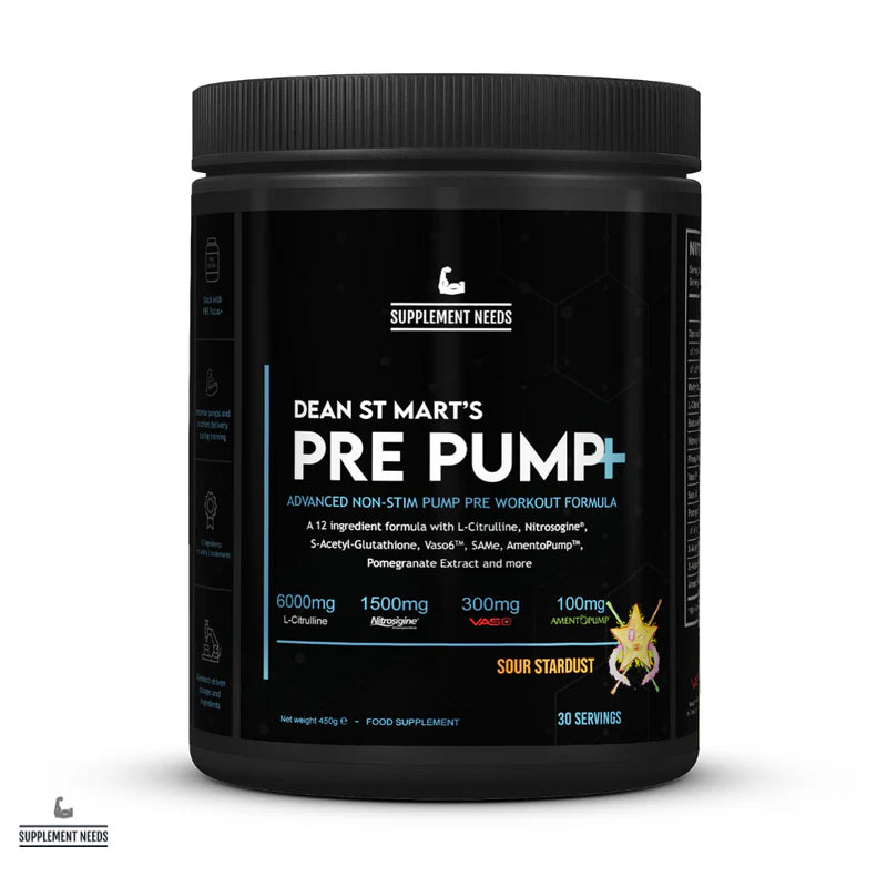 PRE Pump+ is a fully transparent, non-proprietary, non stimulant pre workout pump product containing 12 ingredients at efficacious doses as part of the Supplement Needs Dean St Mart Performance range.